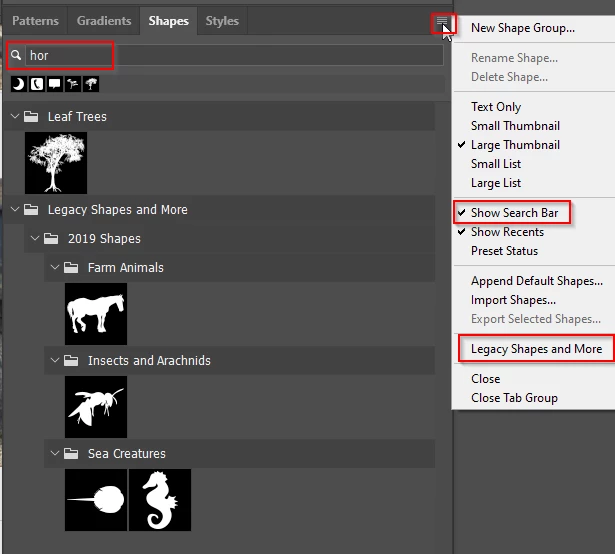 Click to open the Shapes panel menu, and choose Legacy Shapes and More. That will add preset groups to the Shapes panel. Then expand or reorganize the preset groups so that you can get to the shapes you want in a way that's most efficient for you. For example, you might choose to move your favorite shapes into a group that you keep at the top of the panel list.