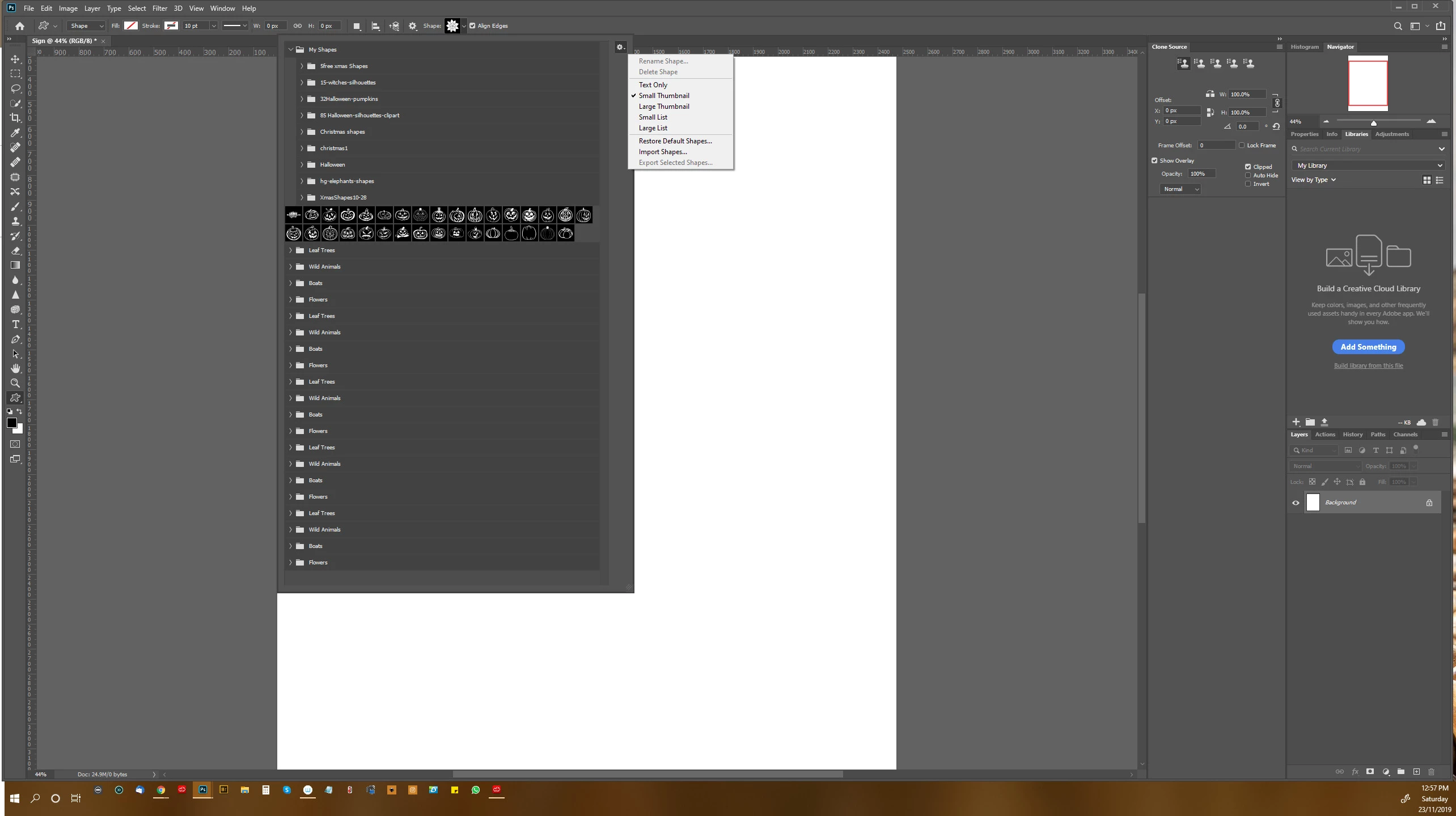 UPDATE: If you can’t open the Shapes panel menu because it is not there, that menu appears only in the Shapes panel (choose Window > Shapes), not when you see the list of shapes provided in other parts of Photoshop such as the options bar. This is consistent with Gradients, Patterns, Swatches, etc. in Photoshop: You manage the list in its panel, which you open by choosing its name from the Window menu.
