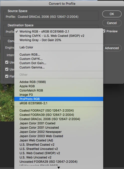 im trying to convert the Photoshop color space profile to ProPhoto RGB, to match the embedded color space of my image files. However ProPhoto RGB is missing from the drop-down list of options in my Photoshop. I can’t seem to find a solution to load this color profile into Photoshop. Has anyone else experienced this? I’m running Photoshop CC 19 (last version before 20) on Windows 10 OS.