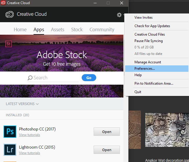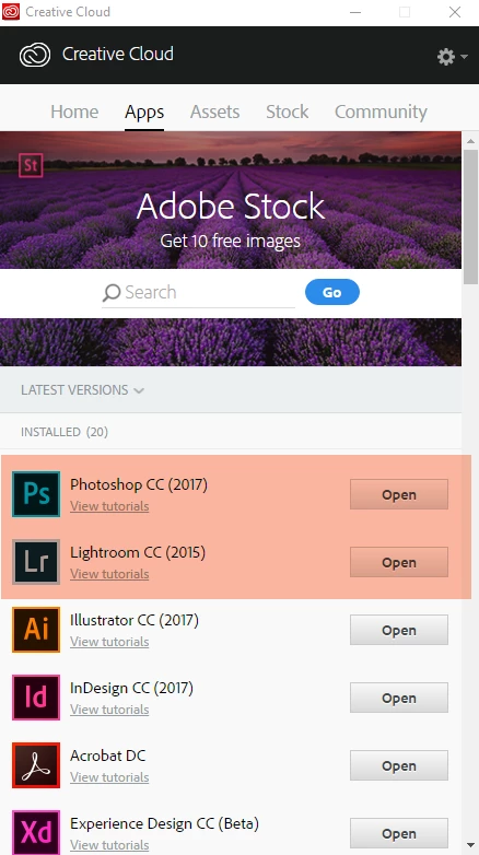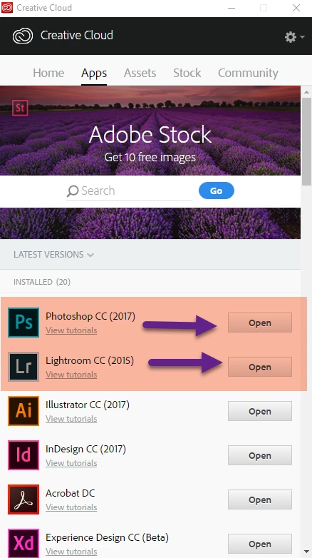 6) Now go back to the 'Apps' section of the desktop Application and click the buttons next to Photoshop and Lightroom. Your buttons will be marked 'Install' not 'open as with my copy.
