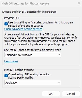 On the "Compatibility" tab, there is a button at the bottom to "Change high DPI settings." (I myself clicked "Change settings for all users" and THEN clicked "Change high DPI settings," but that may not be necessary). Then on that screen you will want to check the box under "Program DPI" AND "High DPI scaling override." Under "High DPI scaling override," I also selected "Application" from the drop down menu, but I am not 100% certain if the other options will work or not. Same for the drop down box under "Program DPI;" not sure if other selections will work or not. Then just hit Okay --> Apply --> Okay. Then the problem should be fixed!