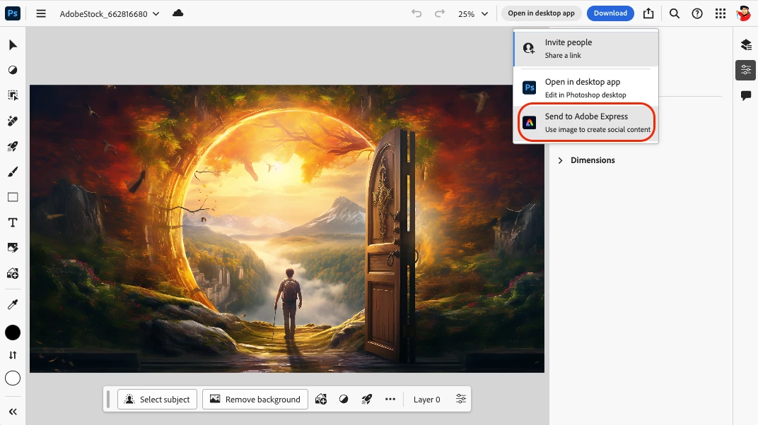 button > Send to Adobe Express to transform your Photoshop on the web asset into social posts, flyers, banners, and more. Elevate your designs by utilizing generative AI tools within Adobe Express.