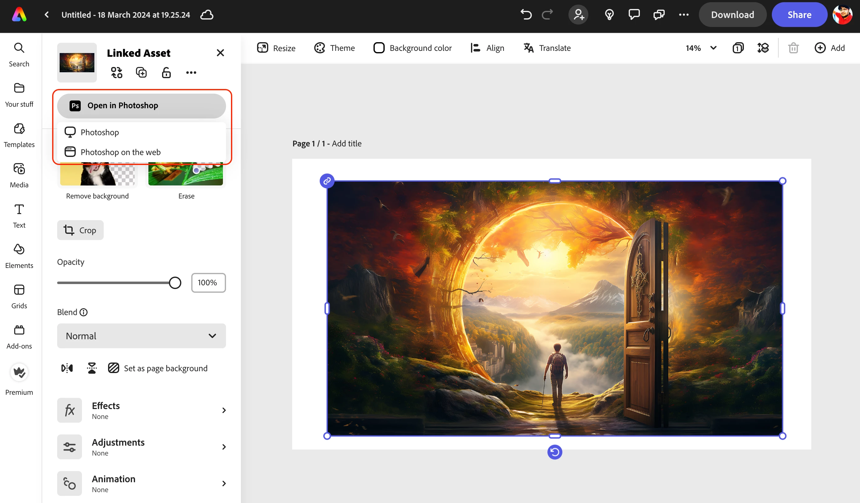 ❸ A new tab opens, presenting the linked Photoshop on the web asset directly within Adobe Express