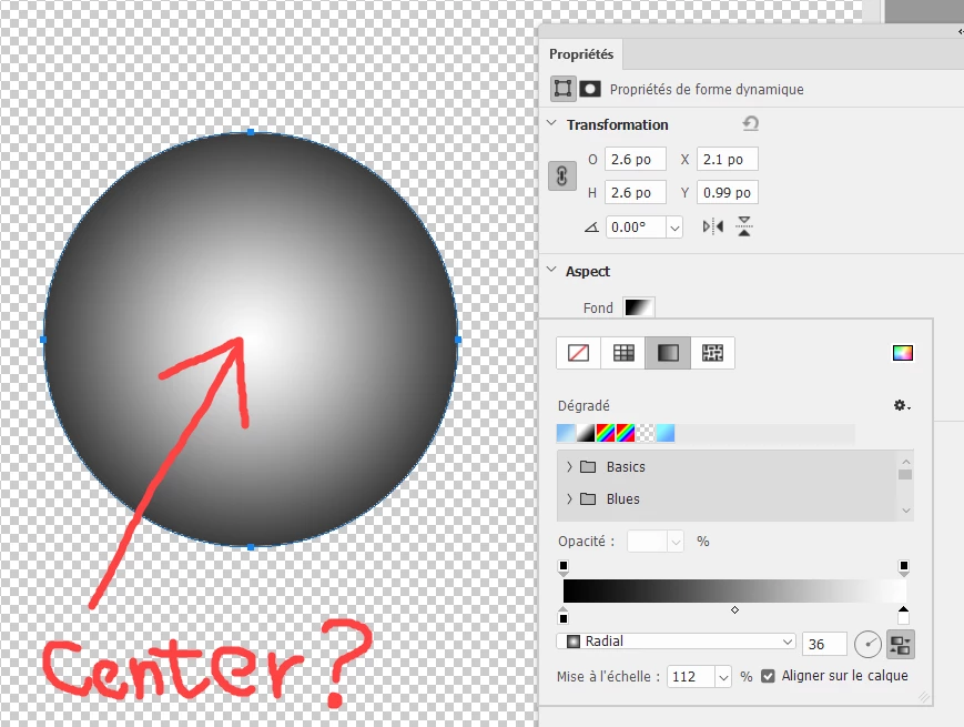 I would like to create a radial gradient inside a live shape, such as a circle, but it seems there are no "control" or interface to do so in the Properties panel? See following screen capture :