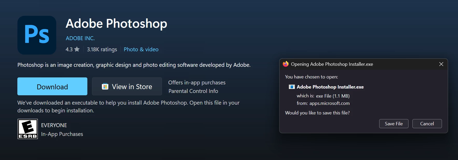 And when I try to install it from the microsoft store, it "installs" but then says there's an error message, but the thing says it's already installed, but if I was to close microsoft store & open it again & search for the Adobe Photoshop program again, it comes up as uninstalled & the "Install" button is there again.