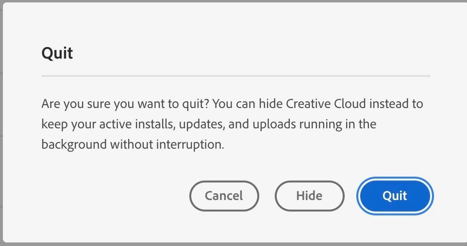 Adobe's idea is to have the Creative Cloud app running in the background at all times, to connect to the cloud. These apps connect through the CC app, not on their own. If you don't want to keep it running all the time, you can opt to start up your Creative Cloud app and log in before starting Photoshop. Or, you can set the Preferences in Creative Cloud, to start automatically, when you restart your computer. When you go to exit the CC app, you'll see this image. If you want to keep the app running in the background, you can select the Hide option.