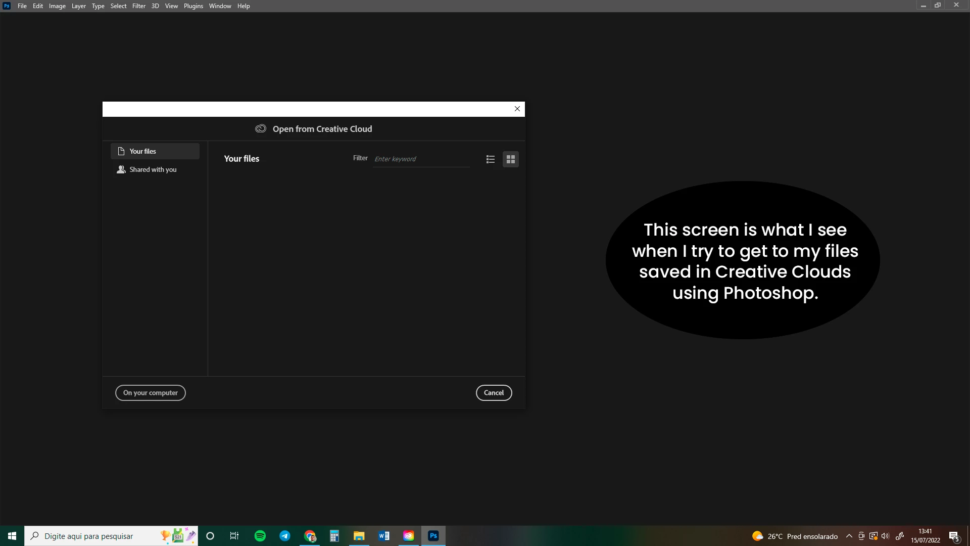 When I open my Photshop, sometimes my cloud files are shown, sometimes not. Then I need to open Creative Cloud app to look for my documents there. All my files are correctly saved there, but I just can't find them using photoshop interface.