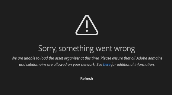 My creative cloud library will not link to my PS. It says. ' we are unable to load the asset organizer at this time. Please ensure all Adobe domains ans subdomains are allowed on your network.' I have no idea how to fix this issue. Please help.