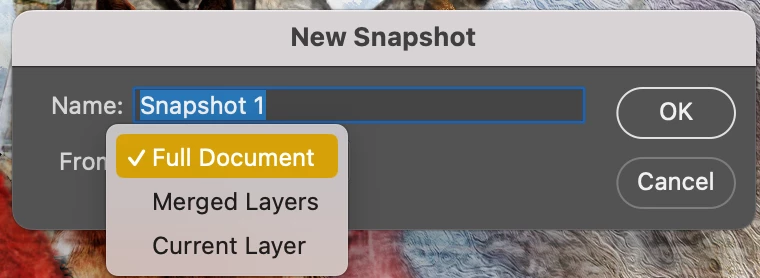 No matter what History Options, even after clearing prefs and resetting warning Dialogs, My History Panel's "New Snapshot" will not bring up a dialog box so that I may choose "Merge Layers."