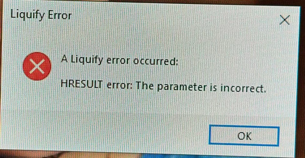 Within about 10 minutes, I tried liquefying the same image and I got this error: