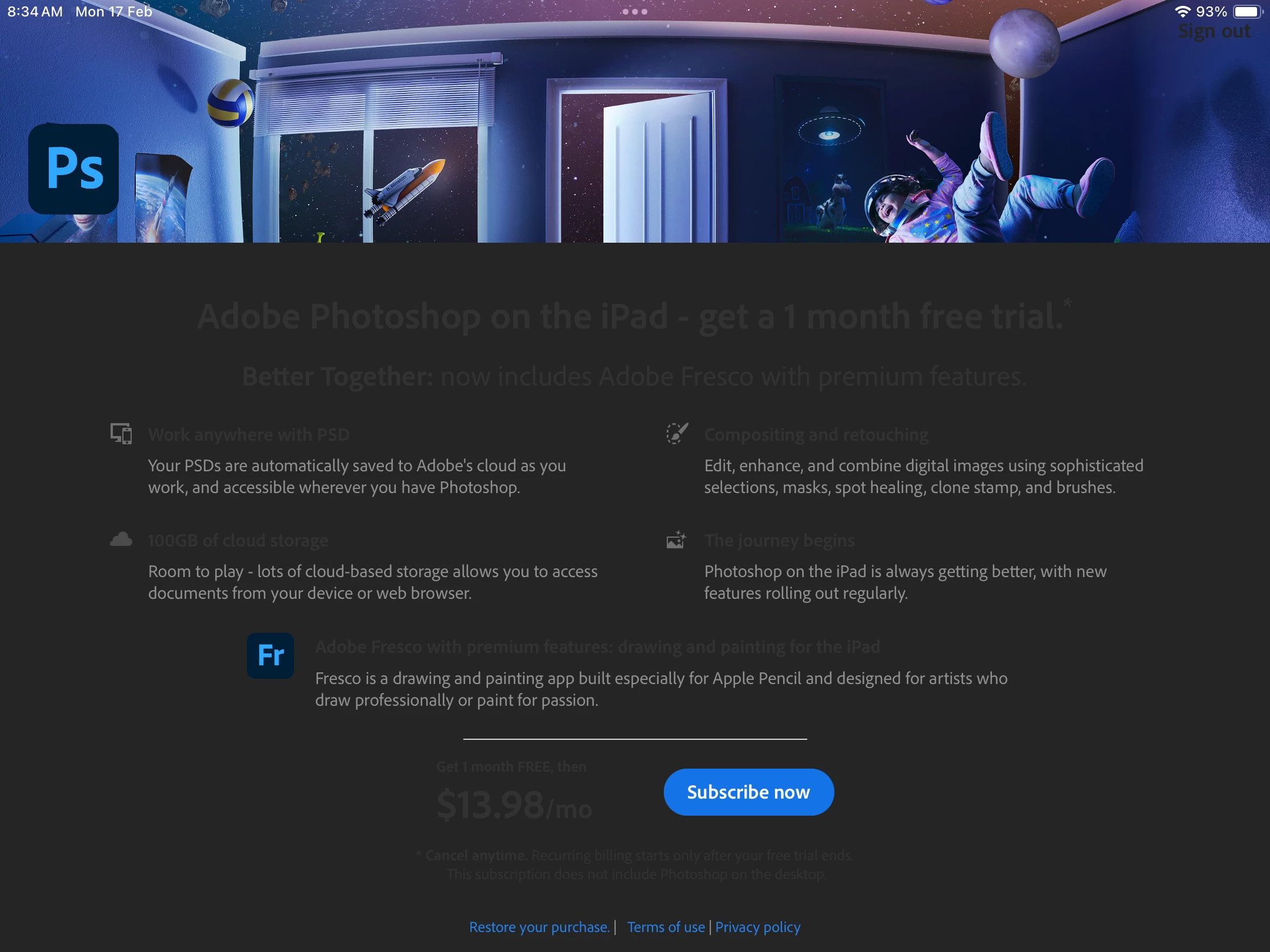 I am using an ipad 9th gen, and I am currently under the JAMF restrictions by my country's Ministry Of Education, (SIngapore). So I have tried uninstalling and installing this app 6 times already, and I tried signing in via Adobe and google, but it keeps leading me here. I can't open the restore your purchases due to restrictions, and it just stays here. Is there anything I can do, or should I just stick to photoshop express that's already there? They all deleted the App Store btw