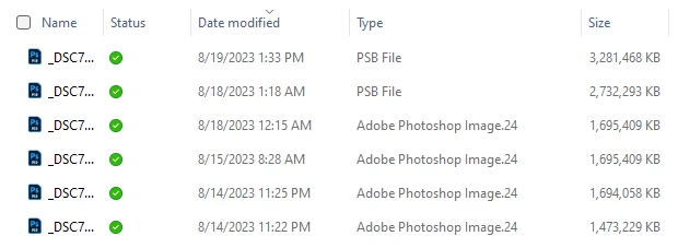 I noticed that all of my .psd files are listed as "Adobe Photoshop Image.24" under the Type column in Windows Explorer in Windows 11. My .psb files are listed as "PSB File" though. I would think psd files would be listed as "PSD File." Below is a screenshot of a few files in Windows Explorer. I never noticed this before. Should I be concerned? I have tried a few of the .psd files and they open fine, but I'm worried something is wrong for them to be listed that way. If people with Windows 11 (or even 10) can check how they're .psd files are listed under the Type column (which is in the details view in Windows Explorer), I would really appreciate.
