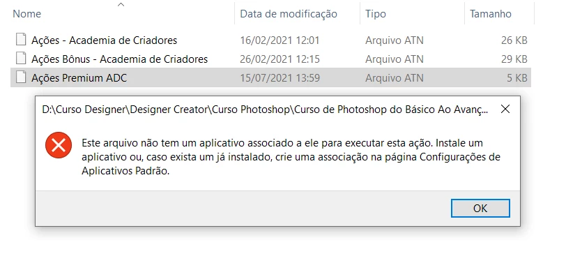 Primeira vez que acontece esse erro comigo. Fui tentar instalar Ações no Photoshop 22.2 que baixei recentemente e não consegui. O arquivo aparece como indefinido também coisa que não acontecia antes, não sei porque. Atualmente tenho 2 Photoshops instalados, o mais atualizado, e o 22.2 pra usar as funções 3D. Alguém pode me ajudar e me dizer porque meu computador não reconhece mais os arquivos nesse formato? Também não reconhece arquivos de Pincéis como reconhecia antes.
