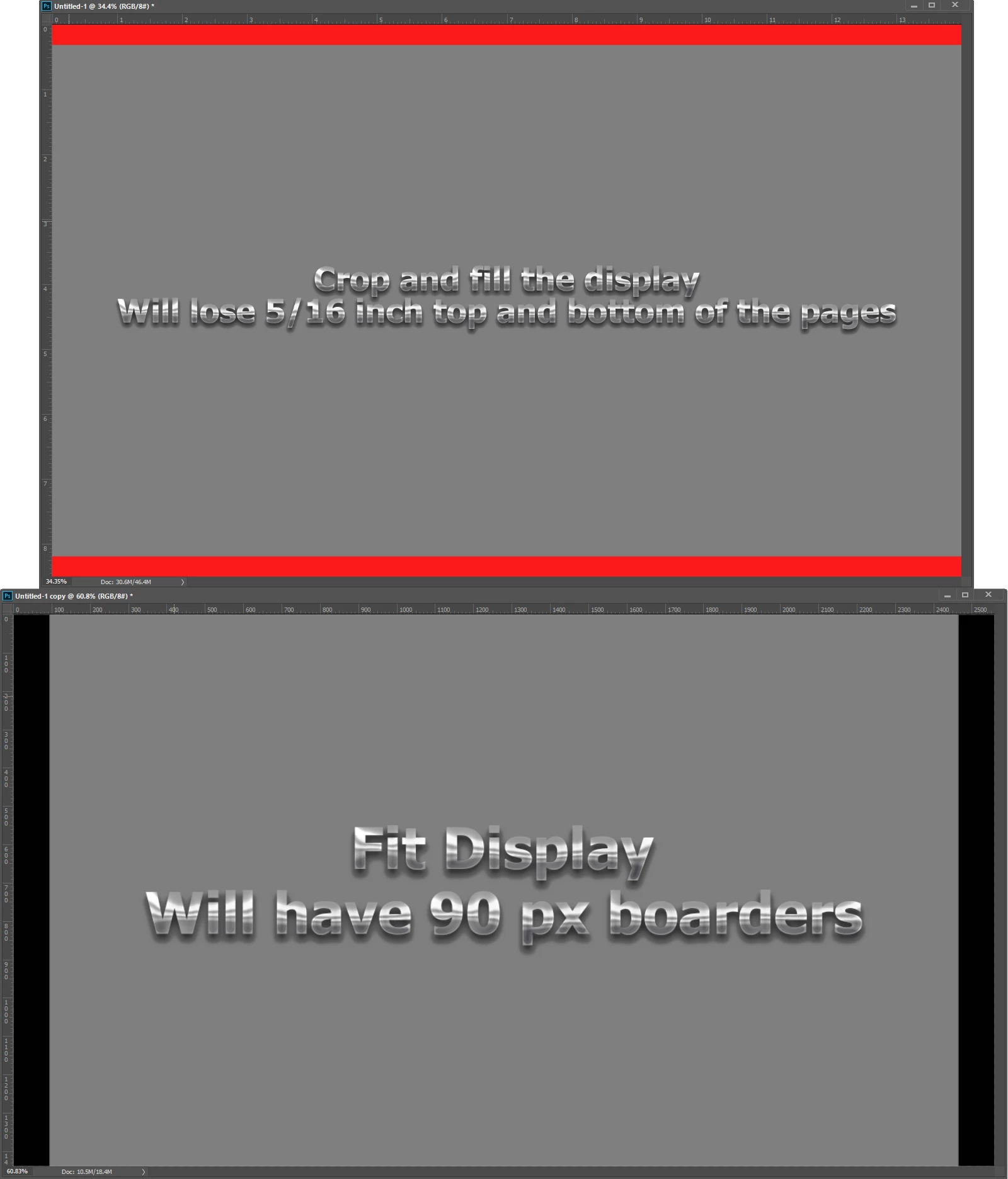 When it come to displays all the counts is the number of pixels you have for the image. Because your image have a different aspect ratios then your display you need to decide if you want to display your image with borders on two opposite sides or crop your images to your displays aspect ratio and fill the display area. You can do it either way. I would not save all the resized pages into a PDF fil. If you have your pages as print size PSD files in a folder it is easy to batch process the psd file and save our Jpeg file to be displayed on your display using a slide show application. First you need to choose borders or crop.
