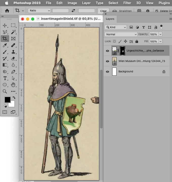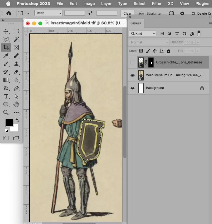 I have an image of a person with a shield, I am looking to replace the shield with a logo of a company. I have played around with the Lasso tool, but when I get to the fill otpion I can only change it for a color, not an image. Can anyone help me? Thank you!