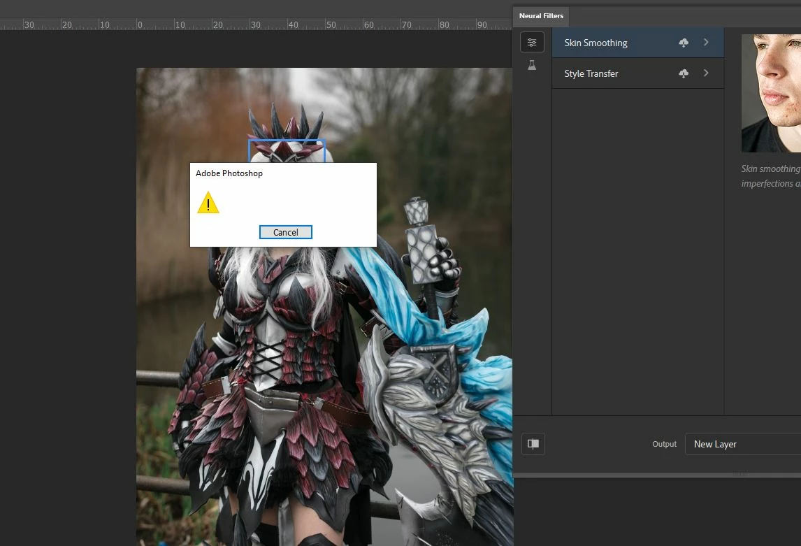 When ever I run neural filters on photoshop v22.1 it will begin to load, come up with a blank error box (see image attached) and will either crash after clicking cancel on the error box or sometimes it lets me run the neural filters, preview adjustments and crashes on hitting OK to apply.