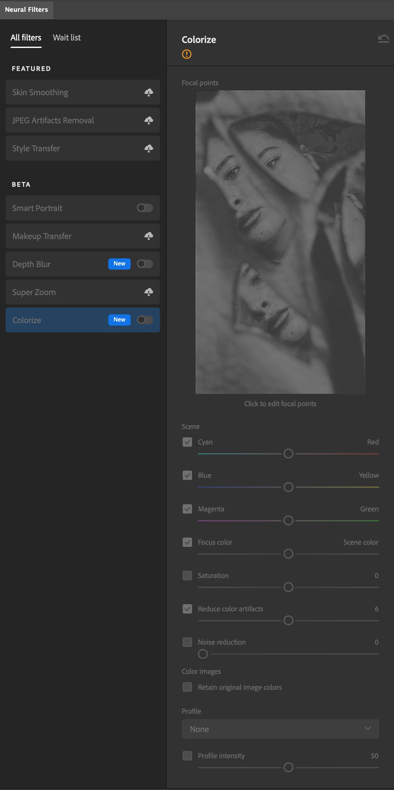 I've just updated to the latest version of photoshop. For some reason my neural filters are greyed out (not in the menu, I see this problem exists in other threads, this is speecifically after I open the nueral filters, I cannot use any even if they are downloaded). There is an orange exclamation but not dialogue explaining the error. I've tried on multiple black and white photos, no change in result. Any idea what's going on?