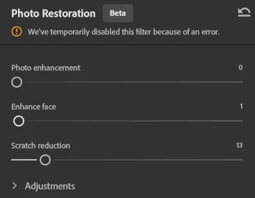 LOL, saying thanks in June 2024. Was trying this one an old photo with two face. In order to get this to work move the slider for "enhance face" to the far left (so it's zero). After this, the fiter doesn't disable. Not useful if you want that feature, but useful if you want to remove scratches (like I did). Amazing something like this is known over a year ago and is still an issue.