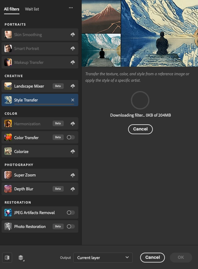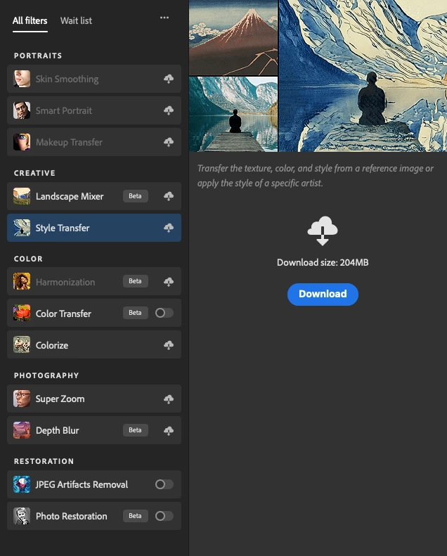 I can't download neural filters. Most of the Neural Filters options appear in the menu, although the 3 Portraits options are grayed out, as is Color Harmonization. When I select the filters I want to use, Photoshop tells me the file size and gives me a blue "Download" button. When I click the button, Photoshop displays a gray circle that should show download progress, as well as text that says "0KB of [___]". But it doesn't download, and a couple of seconds later the download stops and the screen resets.