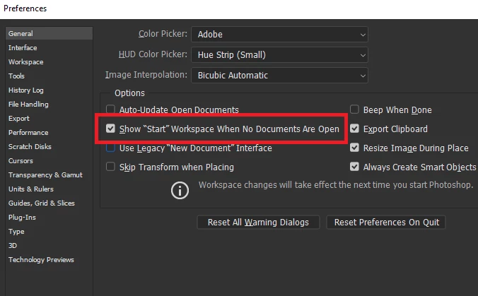 "New document" dialog box disappeared in Photoshop CC 2018