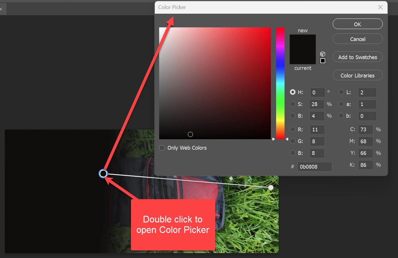 Have you tried to double click gradient handle to open Color picker and change color, see attached screenshot.