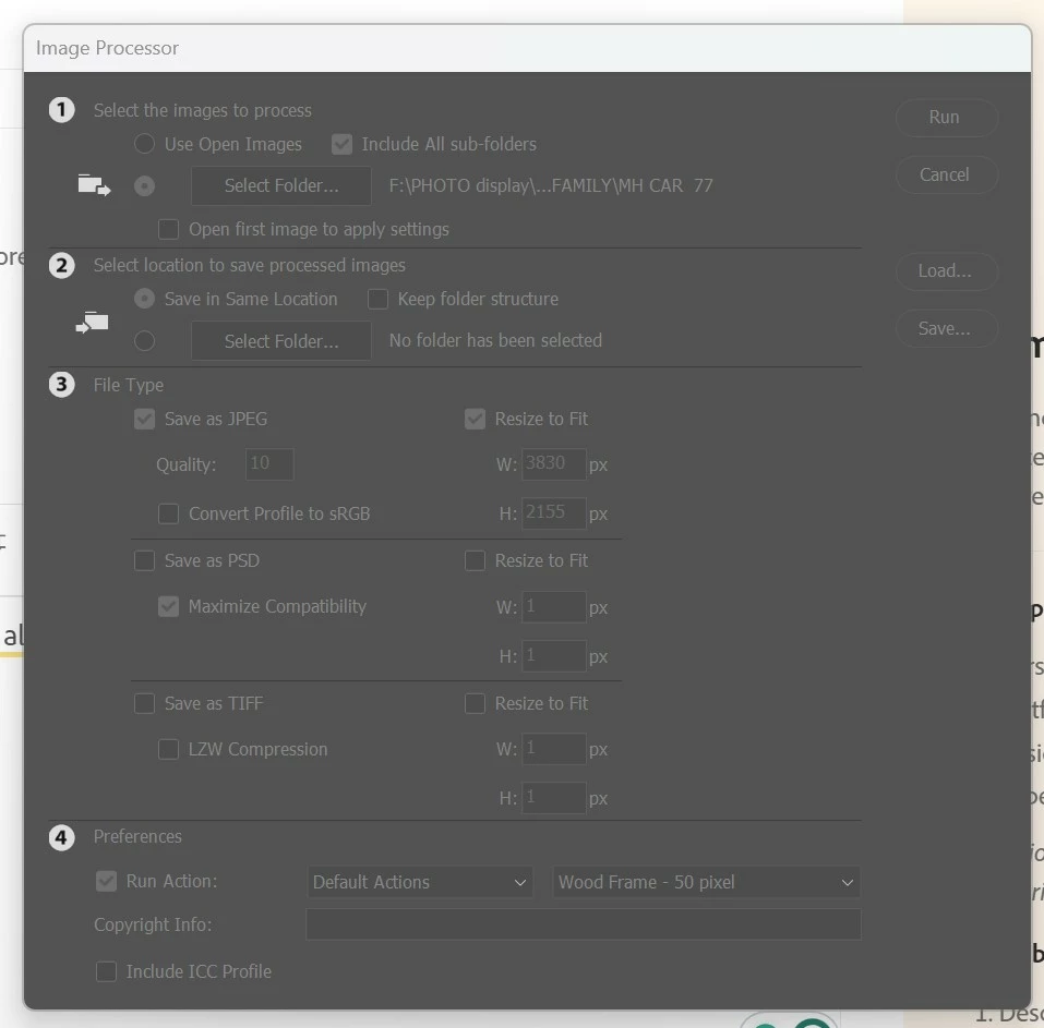 I am trying to resize a bunch of jpegs and also add the default wood frame.