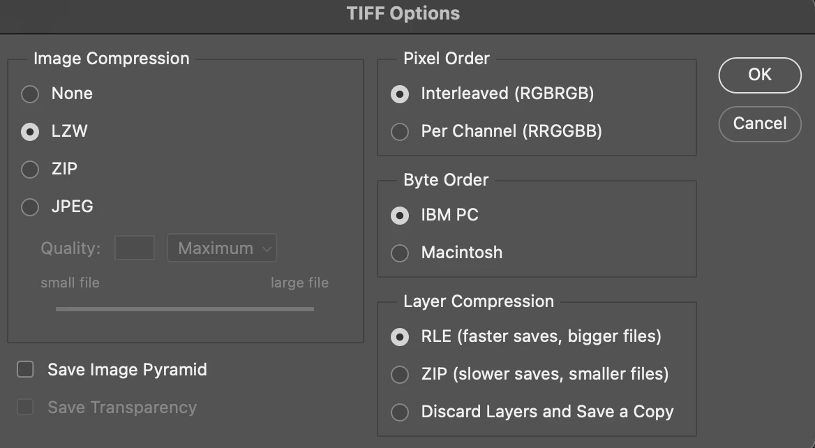 Now the only option I see is to embed the color profile or not, but there are no options for compression (out of the "save as" submenue). Accordingly the files have 250-350 MB, what I find a bit oversized (I have 2TB od SSD plus 20TB of NAS, but no inclination to waste storage space) ...