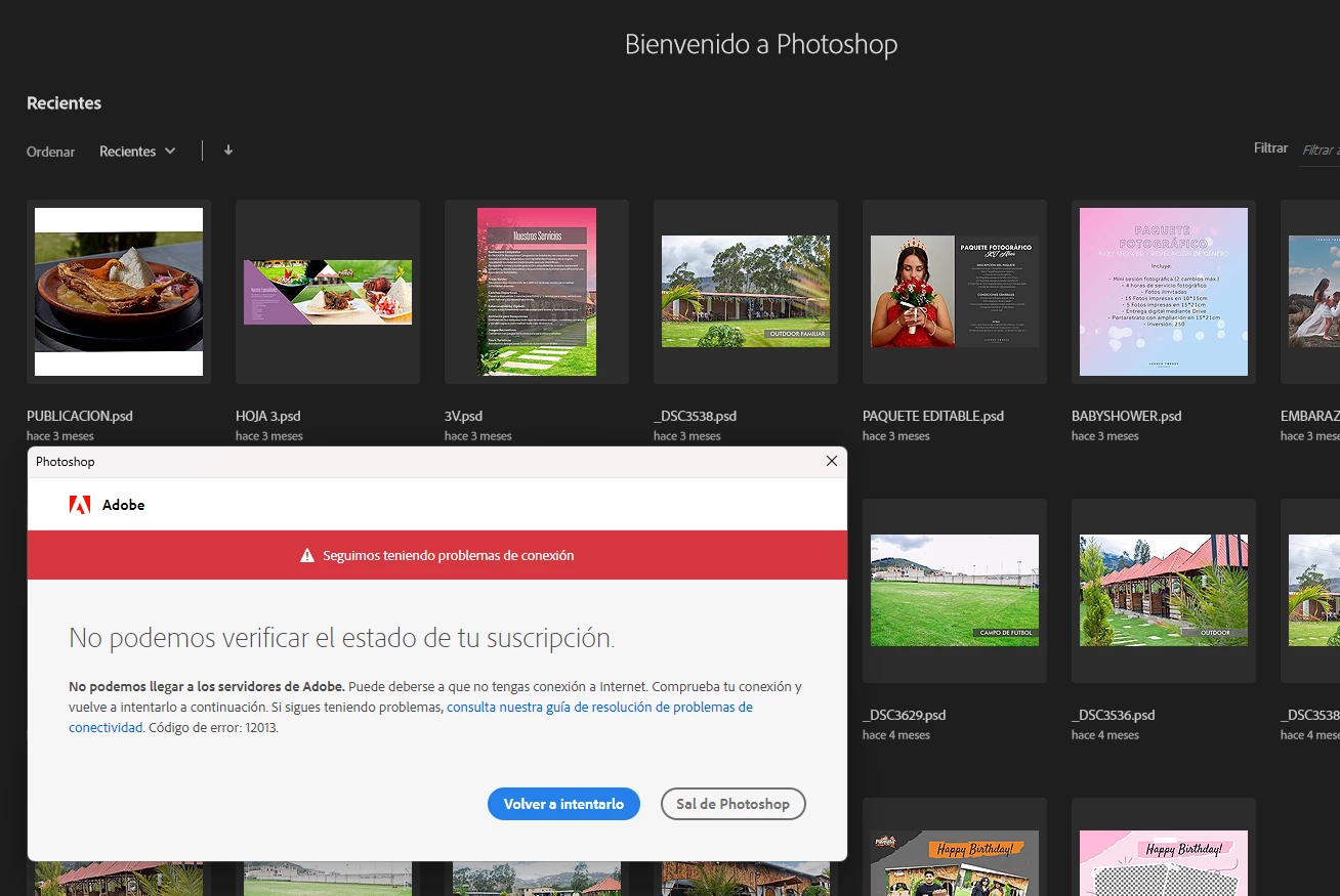No podemos verificar el estado de tu suscripción. No podemos llegar a los servidores de Adobe.