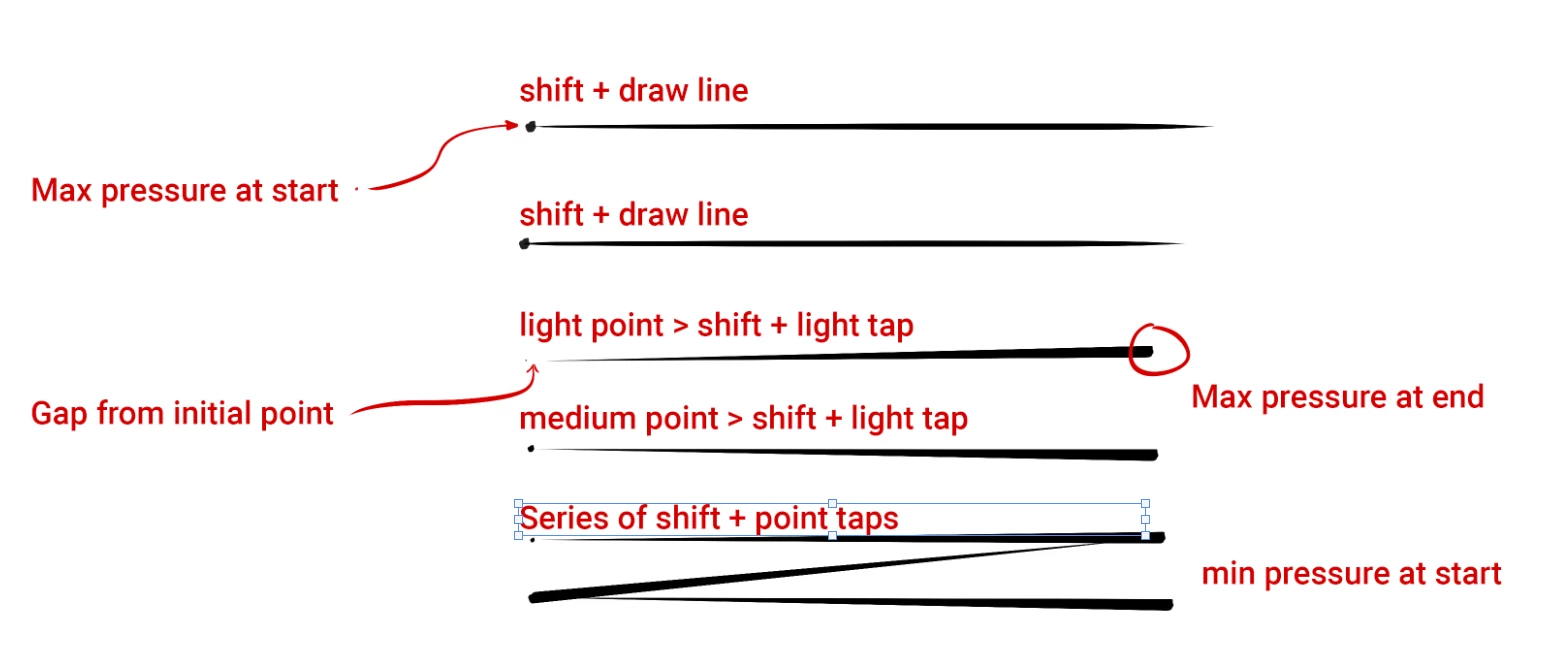 Basically, when you use the shift + brush function try to create a straight line, the initial click uses brush tip minimum pressure and the end click uses brush tip MAXIMUM pressure. This makes the function incredibly difficult to use without adjusting brush settings each time you want to use it. Most people sketch somewhere between min and max pressure and rarely hit those limits. So when you want to create a straight line stroke between two points, having one end use max pressure and the other use min pressure make the line unnatural.