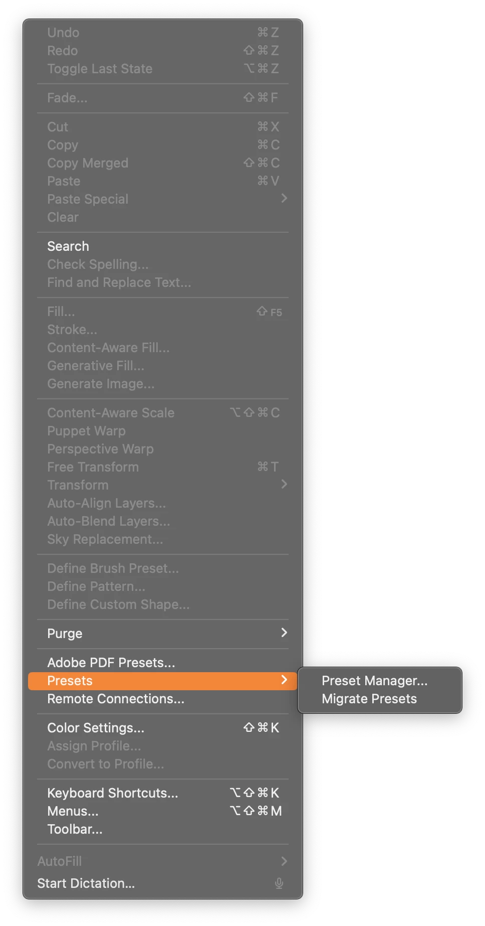 I am trying to import my workspace from another machine and when I go to Edit>Presets there isn't an Import/Export option like I'm used to. (screenshot attached)