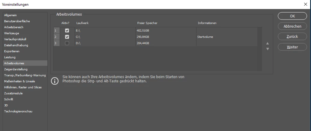 32 GB RAM (performance setting 75% = 22.462 MB RAM availabe to Photoshop)