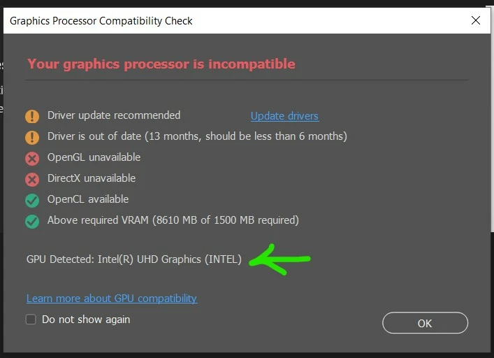 CTRL ALT DEL to shut down Photoshop and upon restart PS it would give the "Your graphics processor is incompatible" and only detect Intel and not NVIDIA.
