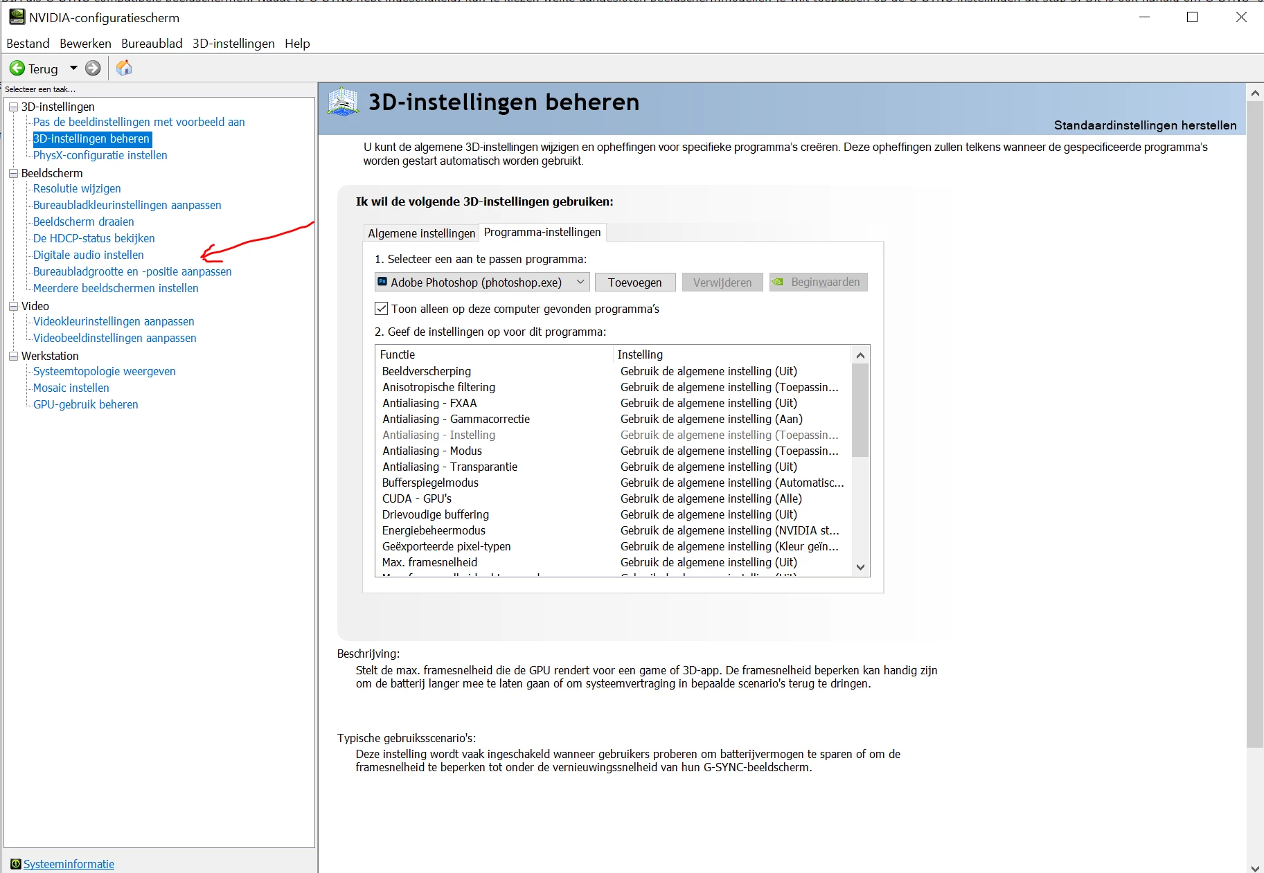 • Turn off G-SYNC for Photoshop, specifically by going into Nvidia Control Panel > 3D Settings > Manage 3D Settings. Click the Program Settings tab, select Photoshop from the dropdown menu, scroll down to Monitor technology, set it to Fixed Refresh, and click apply. To learn more, see Nvidia G-SYNC.