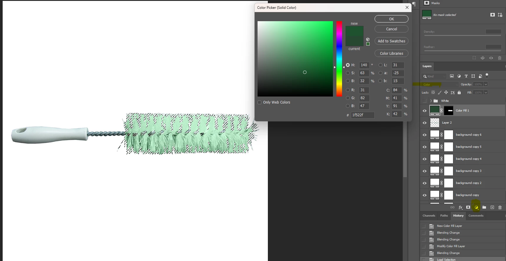 I am trying to change the color of an object, in this case a bottle brush, but any object I use it happends. I will high light the part of the object and select the Color Fill tool and pick the color I would like it to be. However, whenever I click okay and then use the drop down box to select 'Color' it changes the color to a mute/dull shade of the color I wanted to use. This happens with every color I try to use and then I have to use a bunch of other tools to get to the color I want, but that sometimes looks bad and I just get frustrated. I'm not exactly a newbie to photoshop but I'm absolutely no expert so any advice would be great!