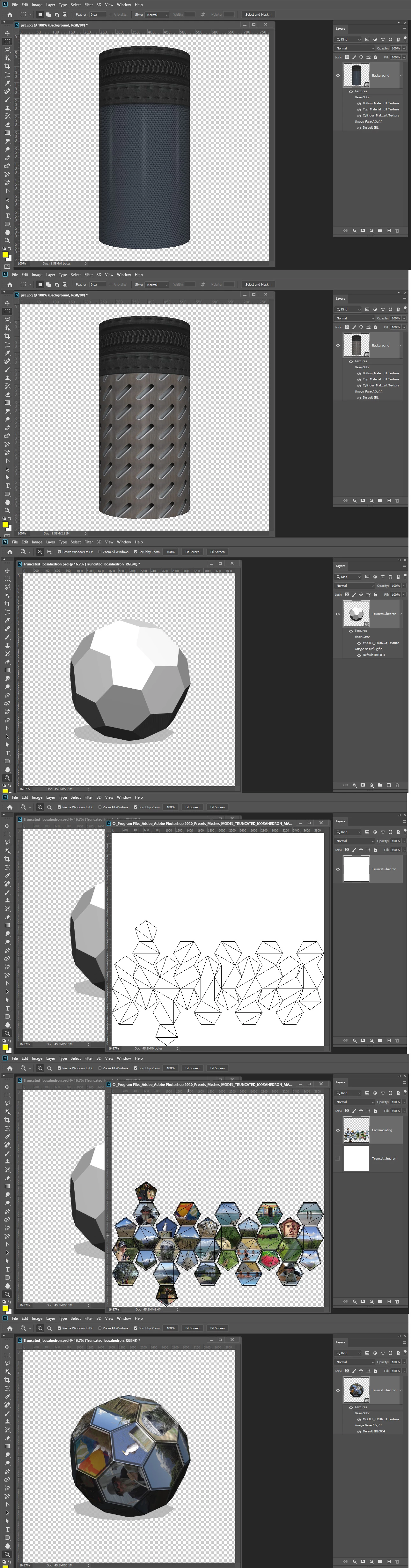 I'm trying to use PS to retouch textures in 3D. The textures of a 3D object are usually very fragmented and look something like this: