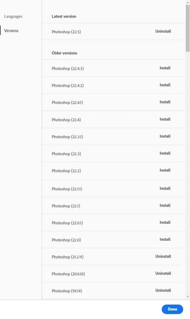 is there anyway of going back to photoshop version 22.3 , the dropdown menu only goes back to 22.4