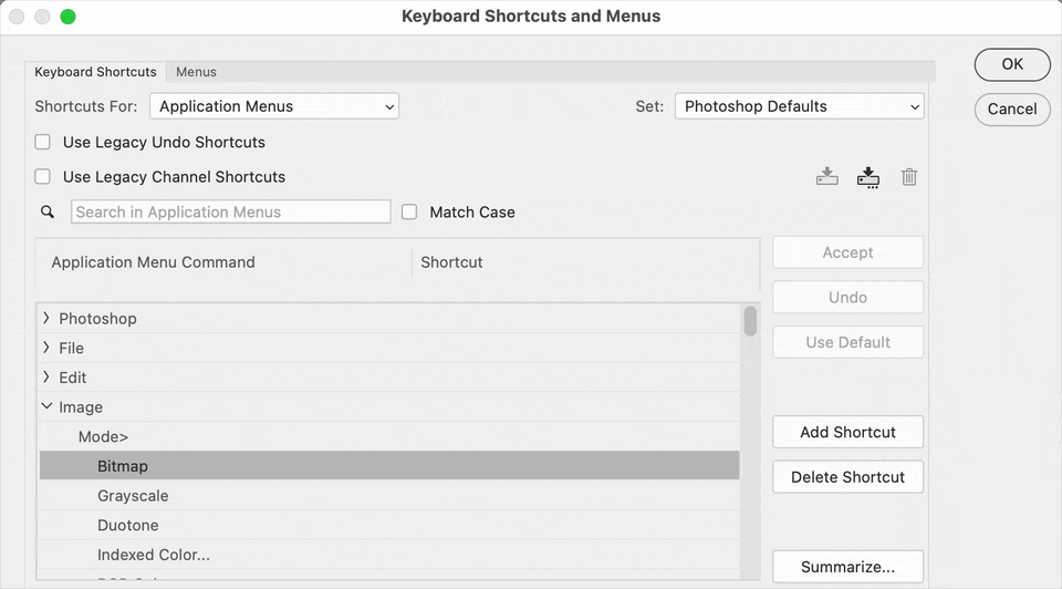 Yes, I agree that the Premiere Pro keyboard shortcut editor is much more powerful and flexible, but the Photoshop keyboard shortcut editor already lets you do what you are asking for. In the demo below of Photoshop, you can see that by clicking the Add Shortcut button, I can add three shortcuts for the Bitmap command, and they all work.