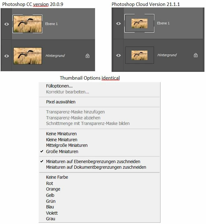 Did anybody come across this behavour of Ps? In Ps version 21.1.1 the thumbnails in the layer section are much smaller than in Ps CC version 20.0.9 although the settings are identical as documented in the screenshot. Would be happy to learn how to fix this. Thank you in advance. -running on Windows 10