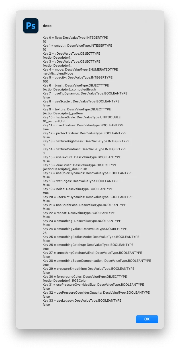 I'm trying to create a script for brush opacity, hue, flow and other stuff because I want to put those on a dial..