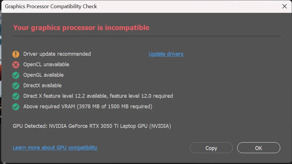 i recently face with open cl unavilable error in photoshop. im using microsoft surface studio laptop with RTX 3050 Ti gpu. i have not this error before.