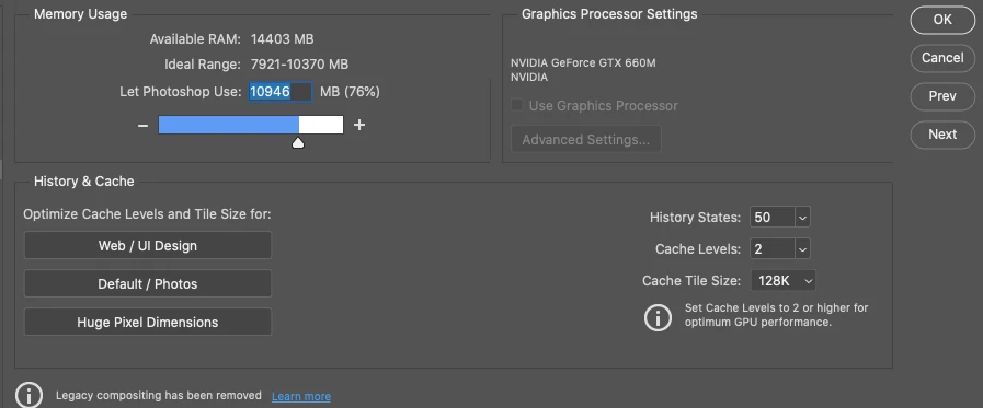 I am having problems with Photoshop files and cannot roatate my canvas. The error message keeps telling me that it only works with Open GL enabled documents, though it had been working fine previously. When I go to preferences/performance (I have NVIDIA GeForce GTX 660M) the 'Use Graphics Processor' and 'Advanced Settings' options are greyed out (screenshots attached). I tried installing an older, earlier version of Photoshop and that now just crashes after a short period. Any suggestions or advice on how to fix this?