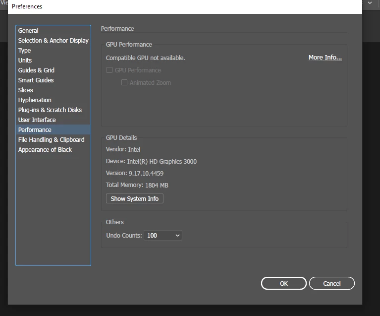 Hey everyone. PLS help. I have an issue with activating a GPU in Photoshop CC 2018. So I needed to use some 3D features on my laptop Dell that I bought and... they were all grey, I couldn't click on any of them. So then I pressed CTRL K to go to preferences and activate the GPU but... no, the box was just greyed photoshop didn't detect any Graphics Processor which is weird, because I've got Intel Core i3 2350M CPU 2.30GHz and Intel HD Graphics 3000 inside, while I have another HP laptop which has Intel Celeron CPU N2840 2.16GHz and just Intel HD Graphics and the 3D features runs on it.