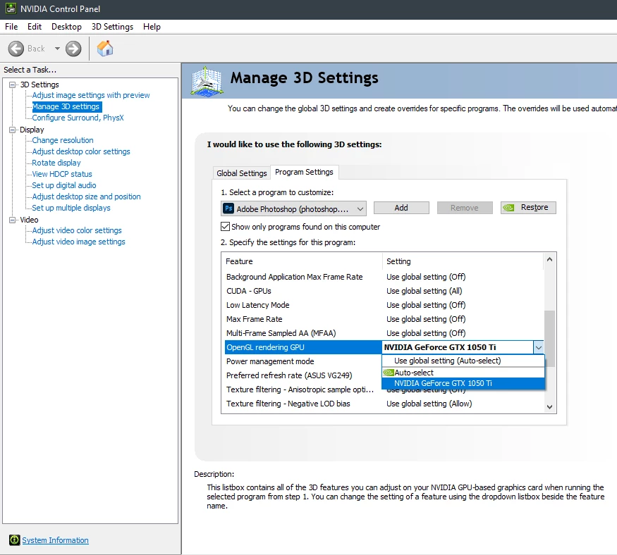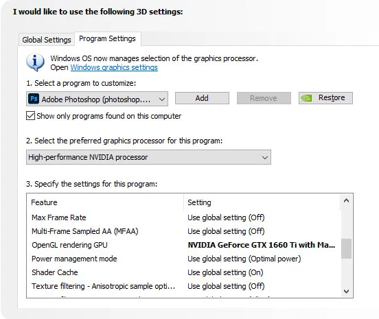 I launched the NVIDIA Control Panel and have changed the preferred graphic processor for both Photoshop and sniffer.exe to "High-performance NVIDIA processor" and I continue to receive the same message.