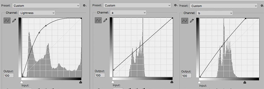 Lab Color, Gradation Mask and the Curves shown above. Dodge and Burb right and left side. Unsharp Mask. Re turn to RGB