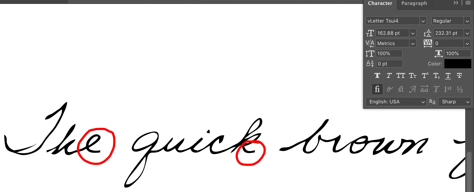 I'm having issues with OTF font tails not showing. First photo shows how the end of each word is clipped off. As you can see, "standard ligatures" option is selected.