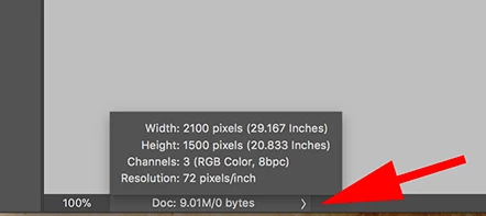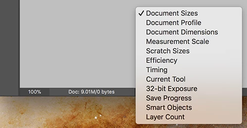 It's at the bottom left corner of the Application Frame. Click and hold on the Doc size widget for more info, or click the right arrow for more view options.