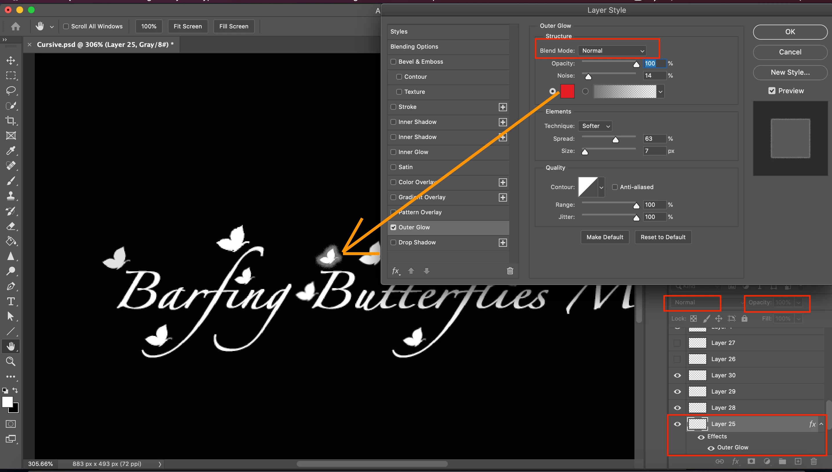 I am using Adobe PS 2021 to create a watermark and I am attempting to put an Outer Glow on an object. The object rests on a black background and was filled with white prior to attempting to put on the Outer Glow. When I add the desired color that I want to use (RED) the glow turns grey Grey. If I move to another color, it stays Grey - when I change the Saturation, it just lightens and darkens the Grey.