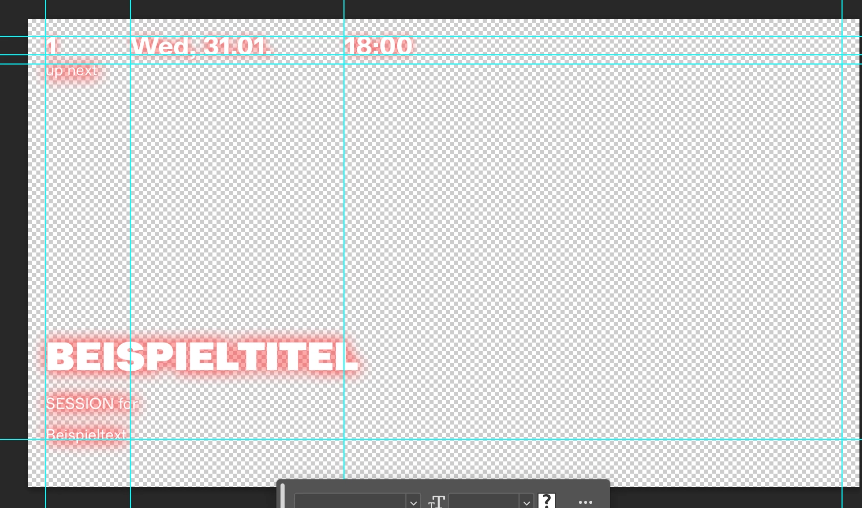 Für einen Overlay in einem Livestream habe ich mehrere Schriftzüge auf transparentem Hintergrund in einer Datei mit einem outer glow Ebenenstil erstellt, die am Anfang des Videos erscheinen und als png mit einem ATEM mini pro auf das Bild gelegt werden sollen.