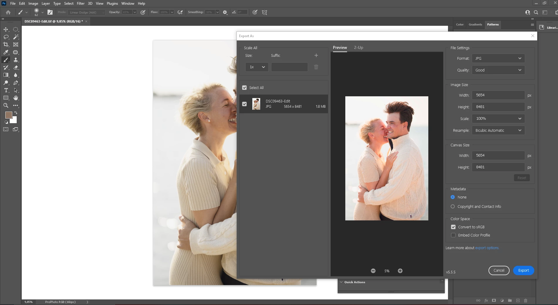 I am having trouble exporting images from photoshop. I usually edit my photos in prophoto and then convert the color space to sRGB when I export ("export as"). However, working with my desktop computer now it doesn't seem to work, and the exported image looks very over saturated. When I try the same process with my laptop the colors doesn't change this much at all.