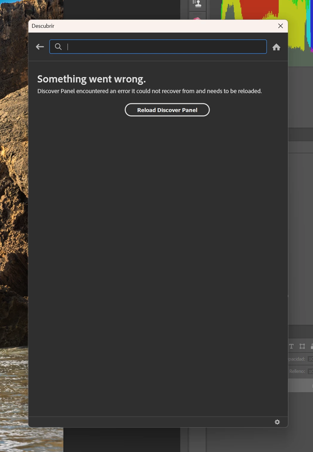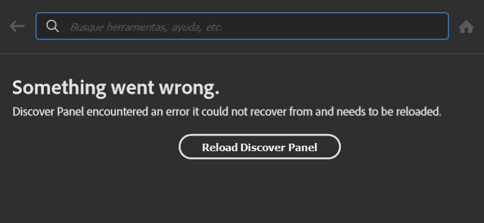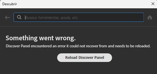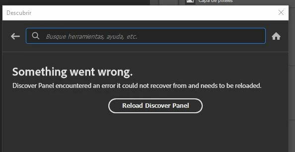 Dear sir, with the last update in Photoshop, the Discover panel is not working. When i press Ctrl+F or click in the magnifier, a windows shows up with a message telling thar Discover panel doesn't work and need to be reloaded. But if i clik in reload button, it does nothing and the Discover panel continues without working.